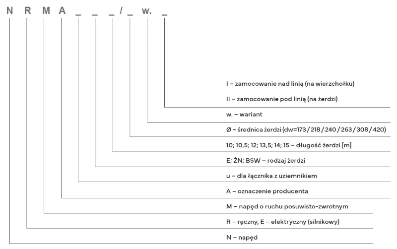 Napędy ręczne do łączników napowietrznych typu NRMA i NRMAu wykonane są ze stali, zabezpieczone przed korozją poprzez ocynkowanie zanurzeniowe zgodne z normą PN-EN ISO 1461:2011P. Są to napędy z ruchem posuwisto-zwrotnym.