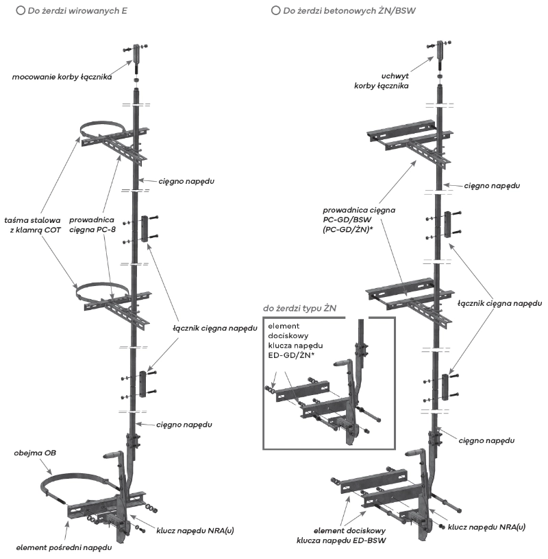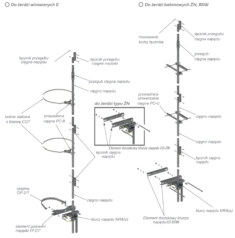 Klucza napędu | Elementu pośredniego wraz z obejmą | Prowadnic słupa wraz z obejmami | Cięgien napędu | Przegubu cięgna | Drążka izolacyjnego (opcjonalnie).