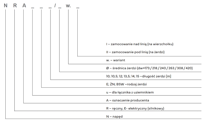 – Klucza napędu | Elementu pośredniego wraz z obejmą | Prowadnic słupa wraz z obejmami | Cięgien napędu | Przegubu cięgna | Drążka izolacyjnego (opcjonalnie).